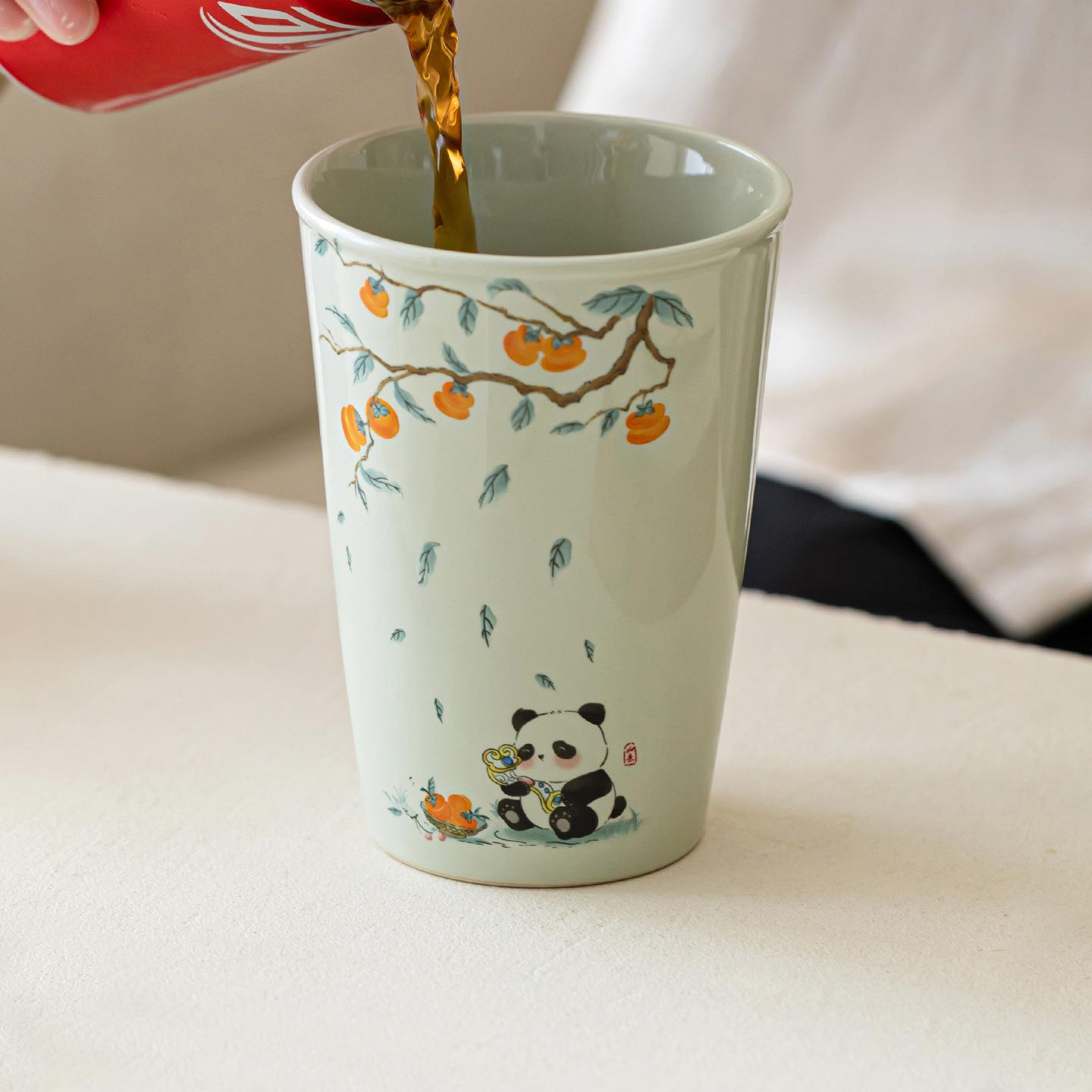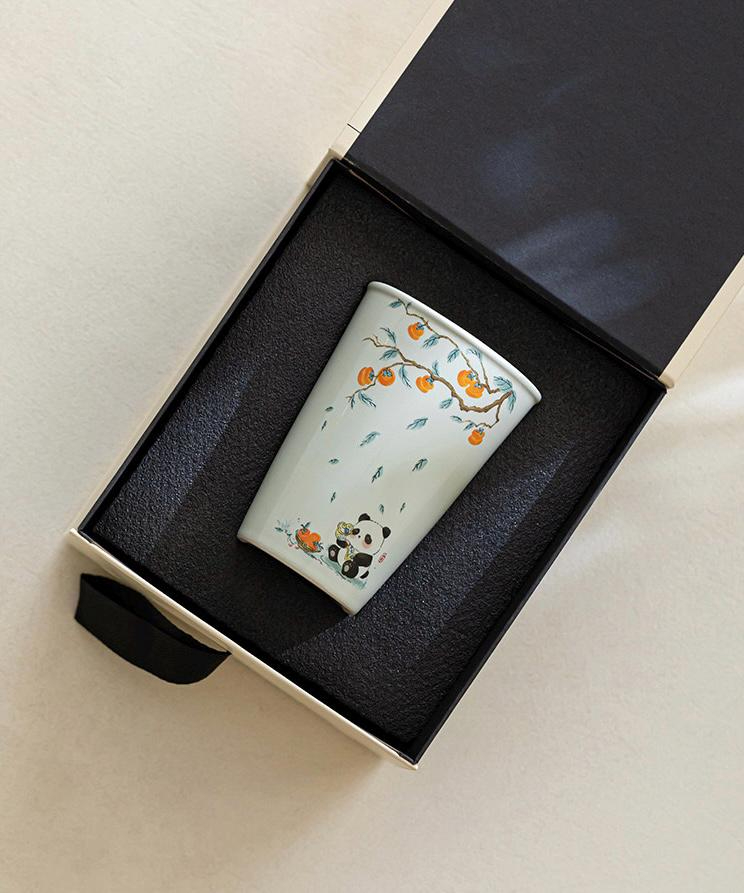 This elegant ceramic tea cup combines traditional craftsmanship with a light, playful charm. Its tall silhouette is beautifully accented with a delicate persimmon branch design, falling leaves, and an adorable panda illustration near the base, creating a balanced look that feels both artistic and refined. The soft plant ash glaze adds a smooth, gentle finish that enhances the cup’s clean lines and timeless appeal.