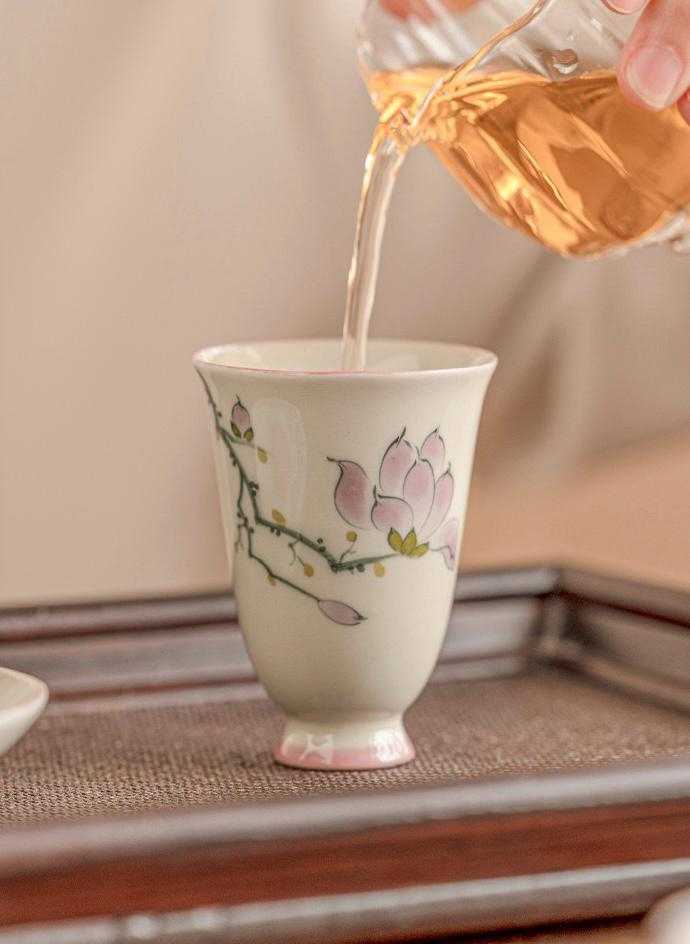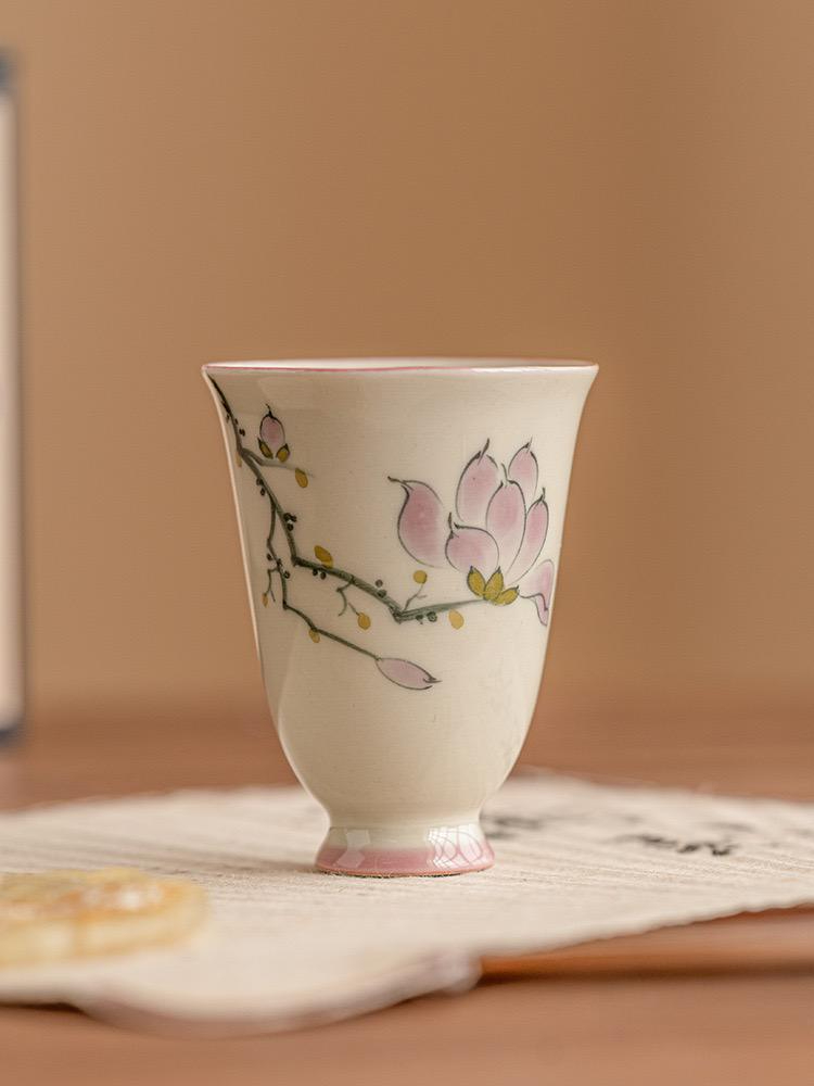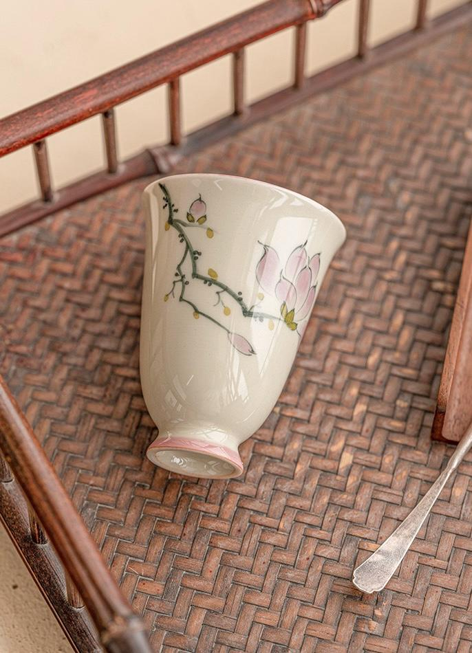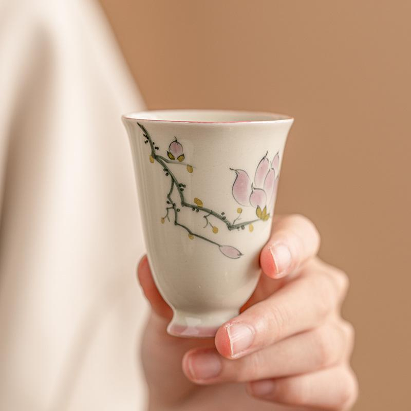 Graceful and delicately shaped, this mini ceramic tea cup brings a refined floral beauty to your tea table. The softly flared silhouette is accented with a lovely pink magnolia blossom design, creating a look that feels elegant, feminine, and timeless. Its slender form and gently elevated foot give the piece a classic, artistic presence, making it especially charming for quiet tea moments and curated teaware collections.