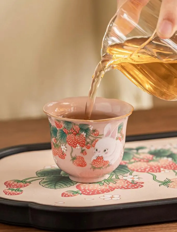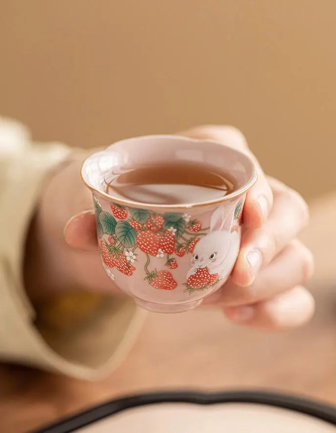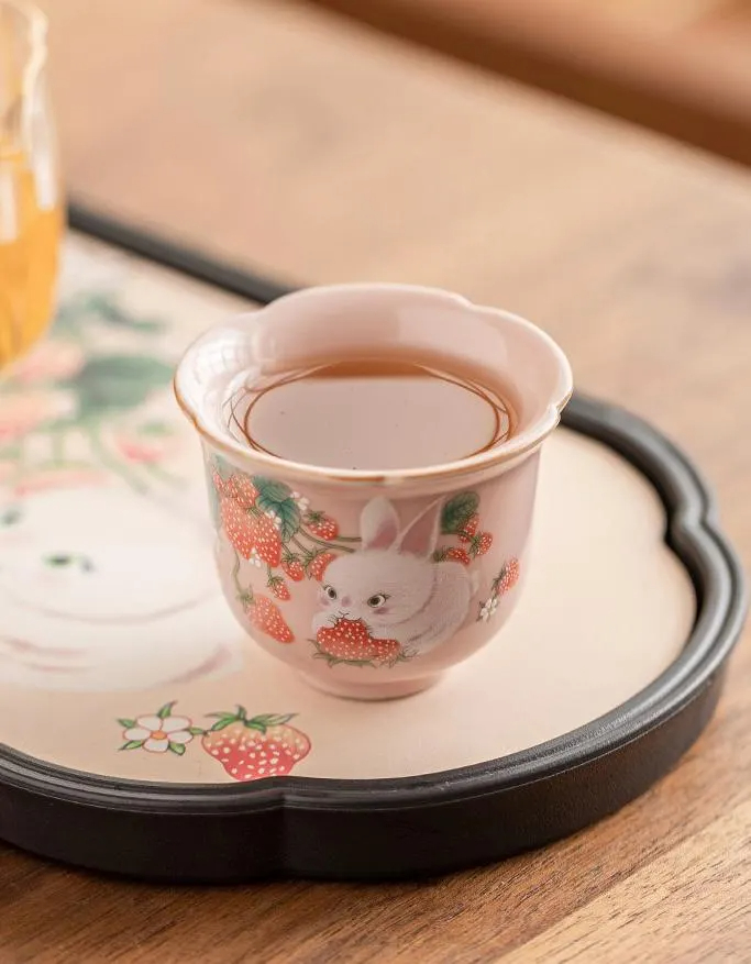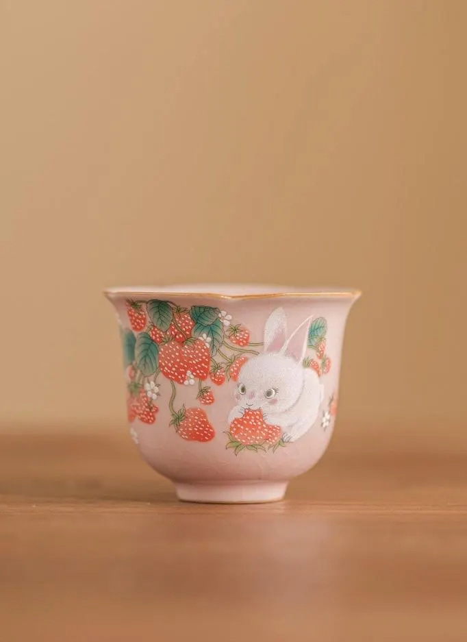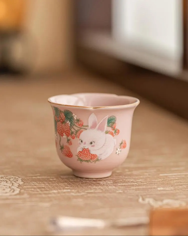Charming, delicate, and full of storybook sweetness, this mini tea cup features an adorable white bunny surrounded by ripe strawberries and soft floral accents. The gentle blush pink background gives the piece a warm and dreamy look, while the softly petal-shaped rim adds a graceful finishing touch. Small in size yet rich in detail, this cup brings a lovely mix of cuteness and elegance to any tea setting.