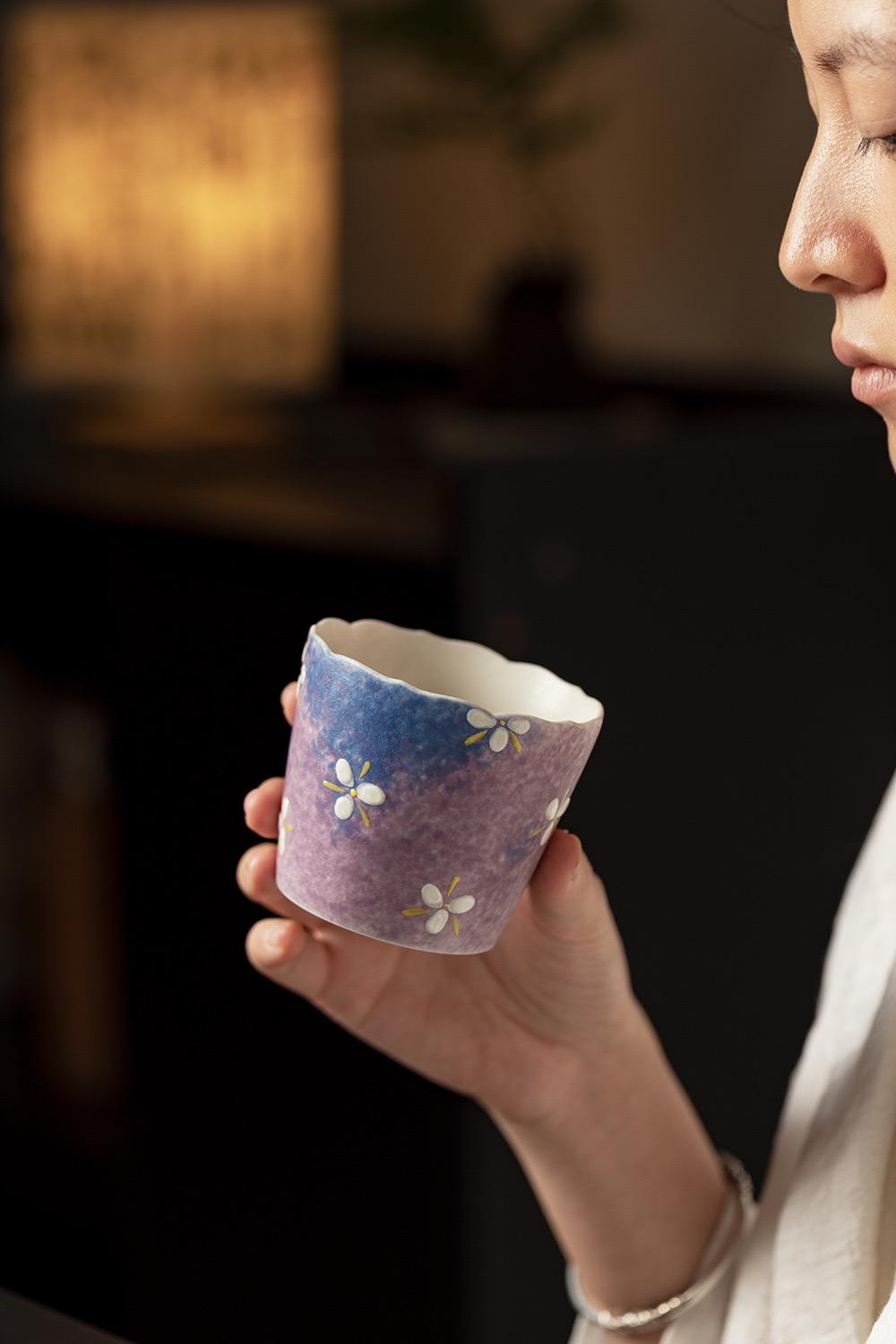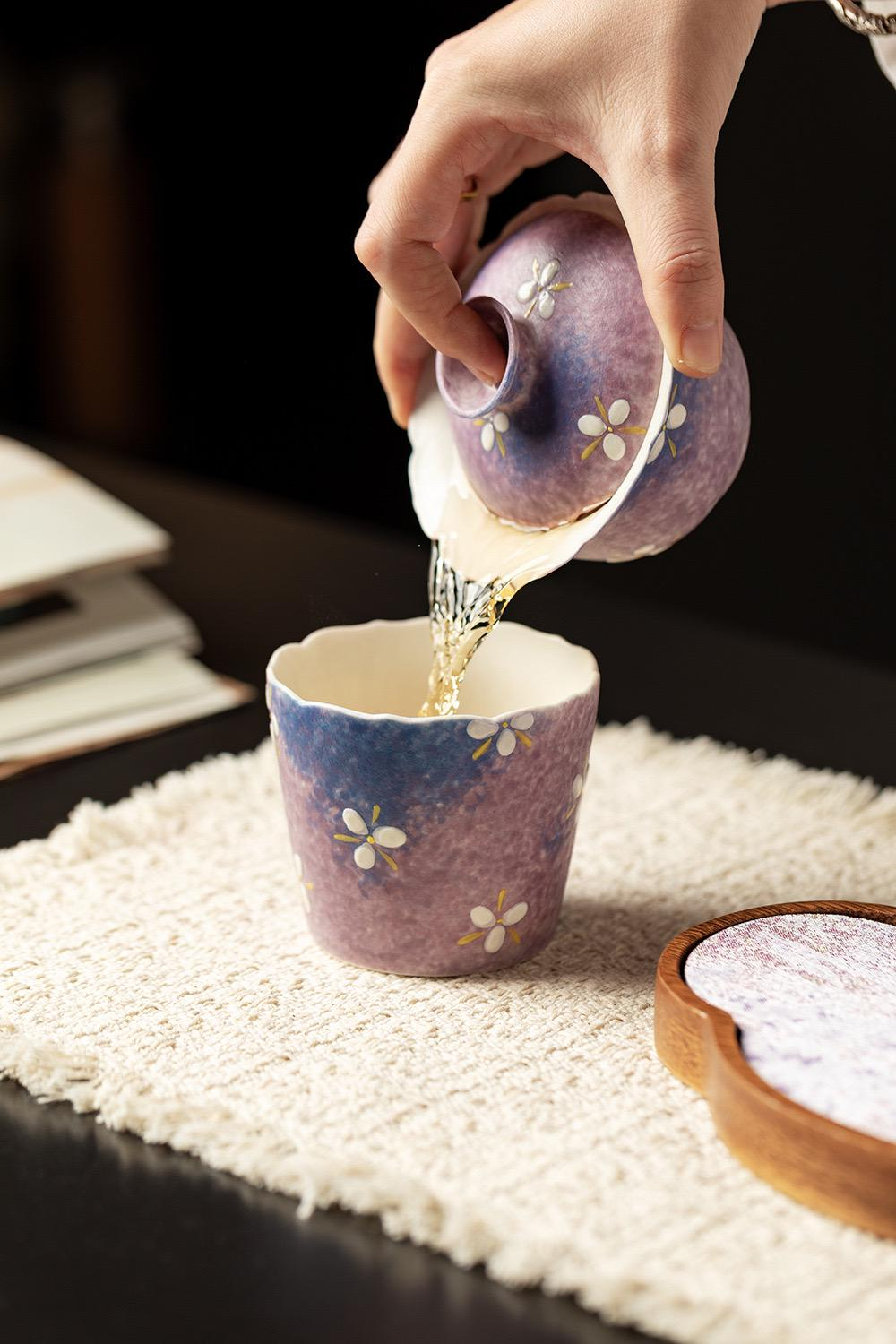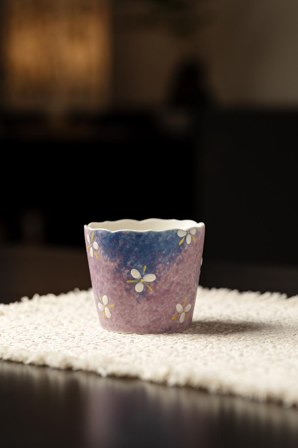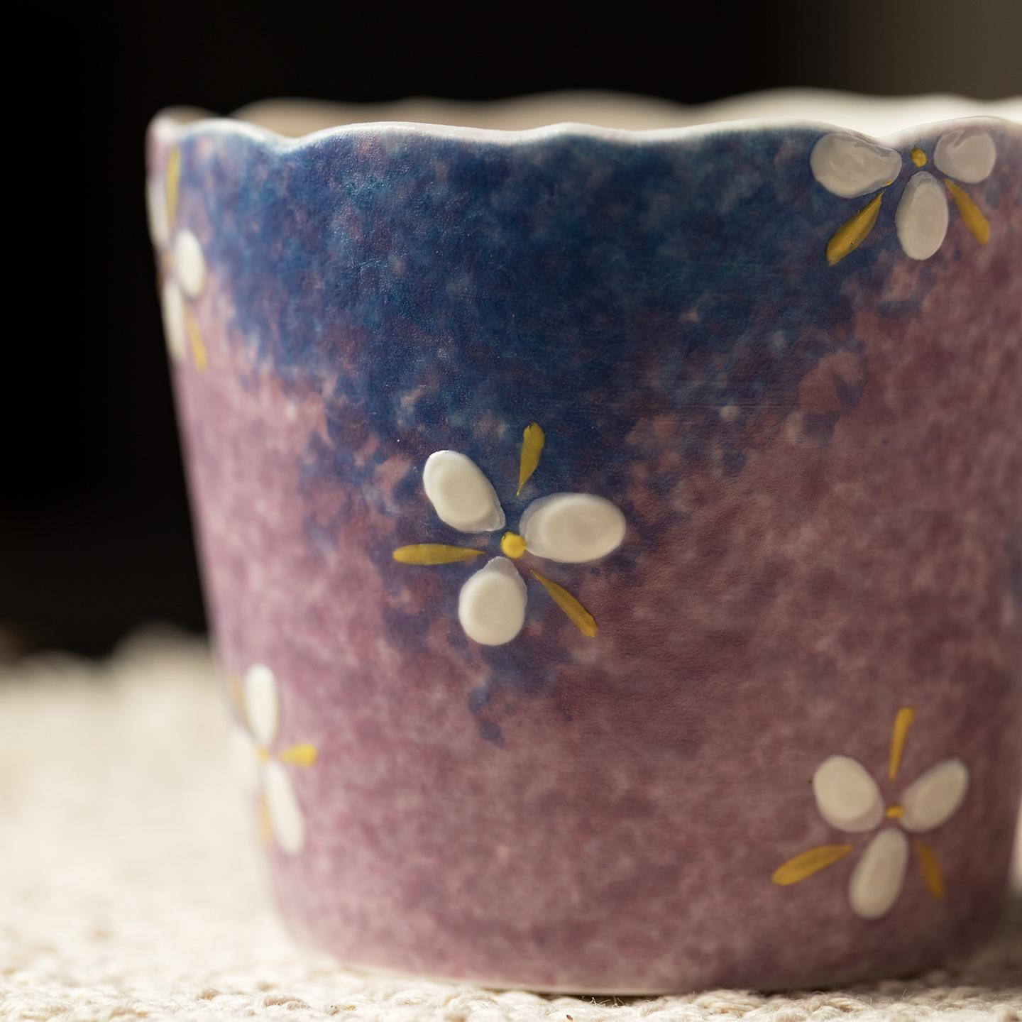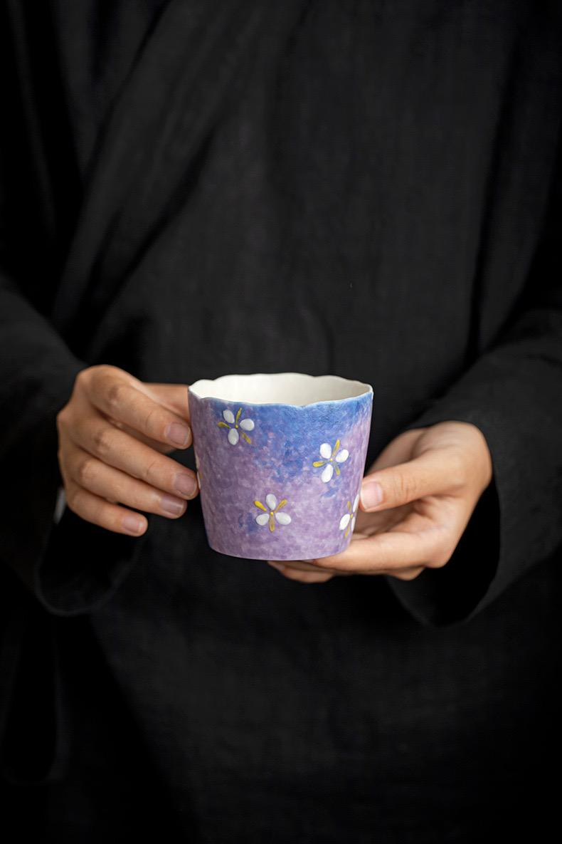 Softly artistic and beautifully refined, this tea cup features a dreamy violet gradient finish accented with delicate white daisy motifs. The gently irregular rim gives the piece a natural, handcrafted character, while the rounded silhouette feels graceful and modern in the hand. Its color palette shifts between lavender and blue tones, creating a calm and elegant presence that elevates every tea moment.